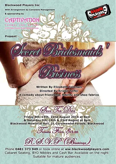 The popular Australian comedy with a bittersweet twist about friendship, fidelity and shoe fabrics. Meg Bacon is getting married in the morning to a man of her dreams, James. She has booked a hotel suite for herself and her bridal party in the night before, but bridesmaid Lucy comes bearing a terrible secret: she has discovered James might be having an affair. She wants to tell Meg right now, but matron of honor Angela is more cautious. After all, Lucy doesn't have all the facts, and does she want to risk ruining her best friend's day over a misunderstanding? As the night progresses and the empty champagne bottles pile up, Lucy and Angela try to figure out what's going on, whilst Meg is distracted by last minute arrangements and her bossy mother Colleen. Act 1 is the night before the big day, Act 2 is the morning of. Would you tell the bride?